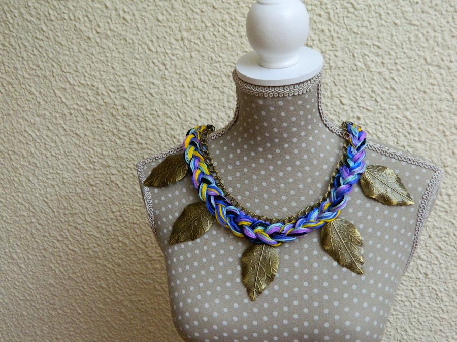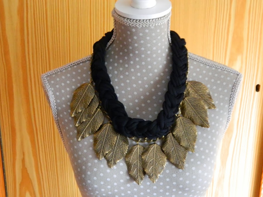 Las dos últimas fotos se trata de una trenza simple con trapillo, y fadena de bronce cosida a este. A la cadena se le añaden las hojas.