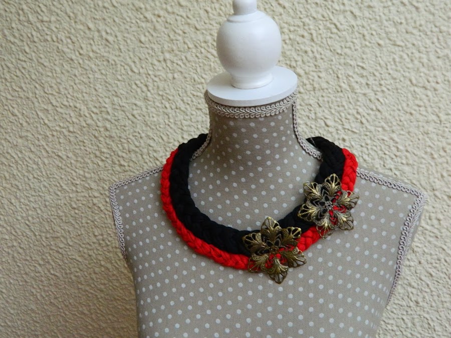 La primera foto es mucho más fácil, siendo así dos trenzas simples con trapillo cosidas entre sí y flores añadidas para decorar el collar!