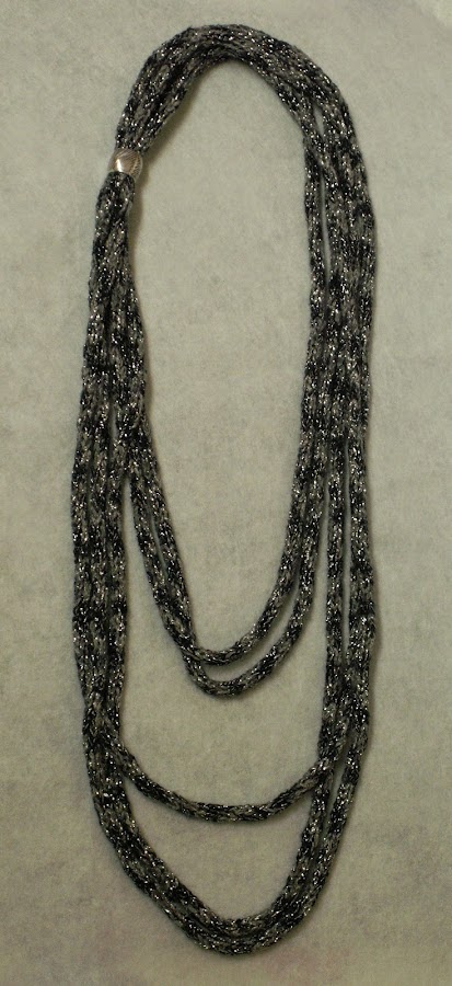 Este último collar esta hecho con hilo matizado, que combina tonos negros y plateados. Le he puesto un anillo metálico a juego. Como el collar lleva varias vueltas nos permite jugar con el largo de cada una, haciendo que sean todas iguales o, como he hecho en este caso, hacer varios largos en cada vuelta. Queda un collar bien elegante, para lucir tanto en un evento informal como con en uno mas formal.