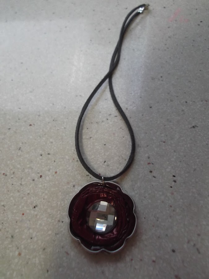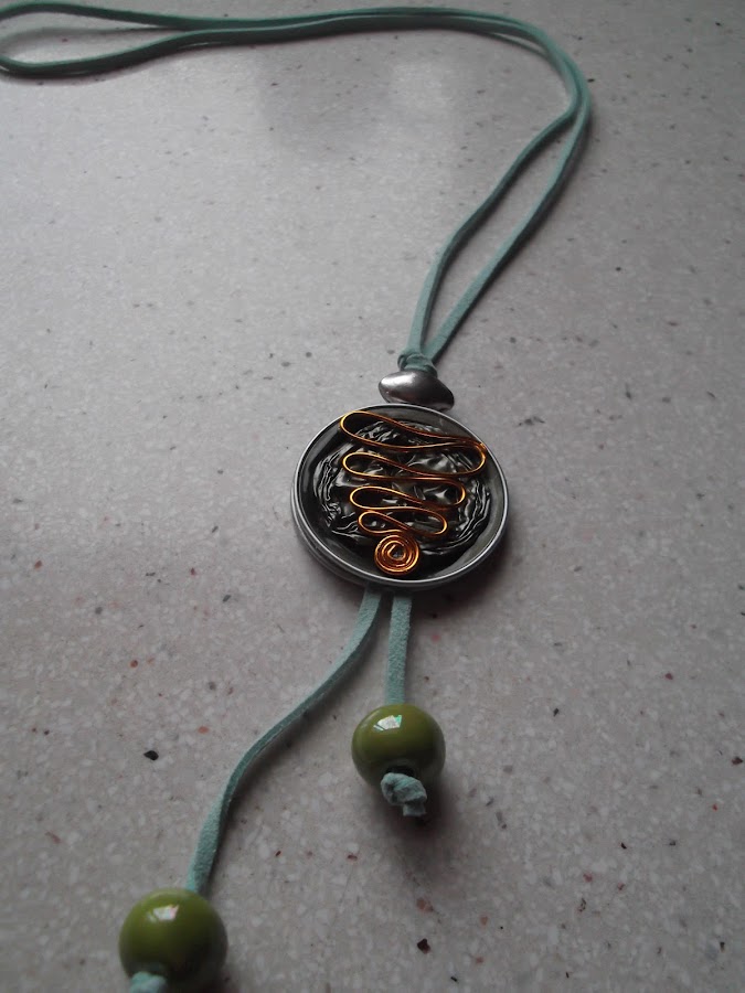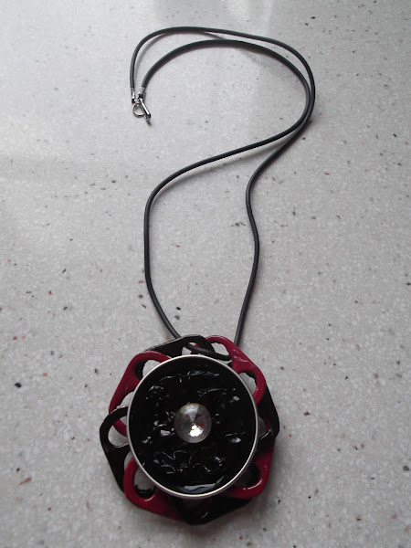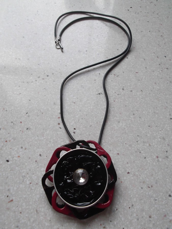 EN NEGRO CON PIEZA DE CRISTAL. ALREDEDOR LLEVA ANILLAS DE LATA COLOREADAS