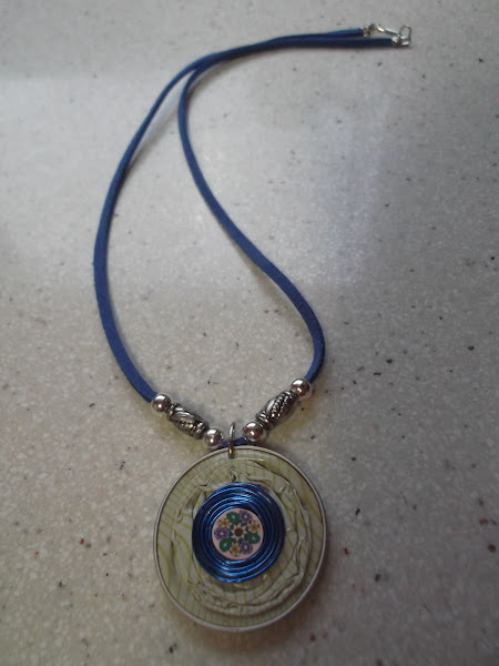 EN TONOS CREMAS Y AZULES CON ABALORIOS METALICOS , ALAMBRE Y PIEZA DE FIMO