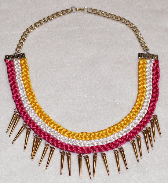 Este otro collar es de estilo étnico, con las espinas doradas y combinando tres trenzas de cola de ratón de diferentes colores muy veraniegos. Las trenzas están hechas con cuatro cabos, para darles mas empaque y armen más... Además de que me gustan bastante mas que las de tres... jejejejejeje