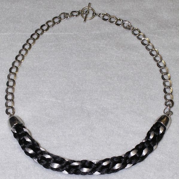 Aquí os muestro otro modelo de collar hecho con el tricotín. Es muy sencillo pero me parece que queda muy elegante, que el negro siempre viste mucho. Esta hecho con hilo de algodón intercalado con hilo de costura normal en diferentes tonos de rojo y rosa, para darle un toque de color. La trenza, como veis, también esta hecha con cuatro cabos.