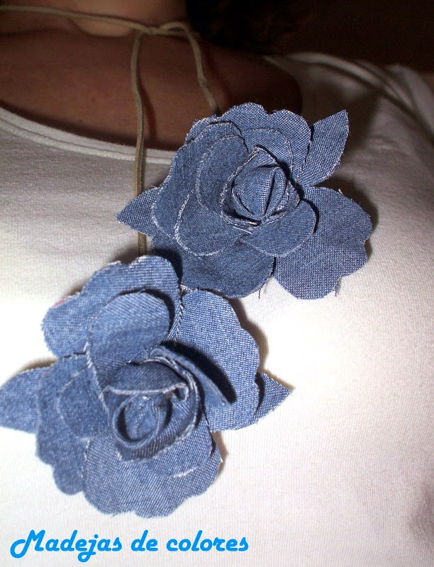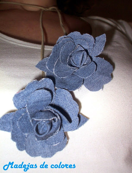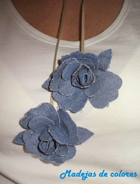 Y primaveral, es también este collar de rosas shabby de Francesca, realizada con tela vaquera y la misma antelina beige que el anterior.