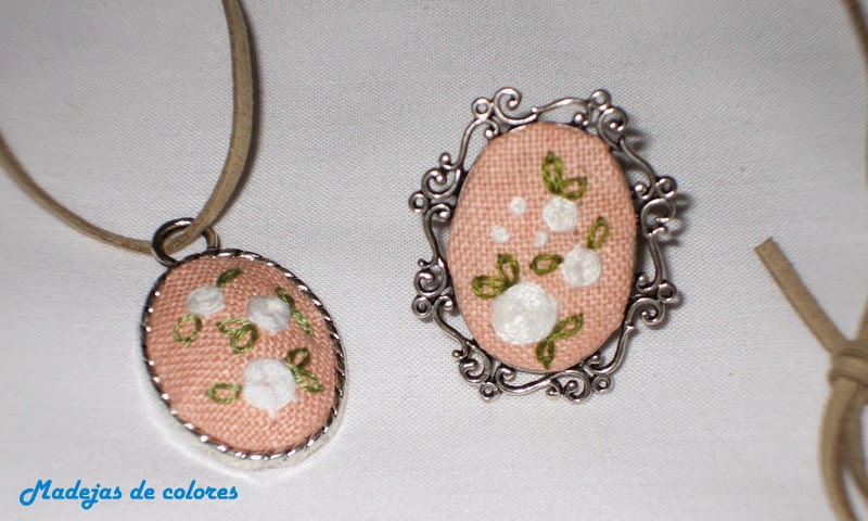 Así que me puse manos a la obra, y me hice un conjunto de collar y anillo bordados en blanco, sobre lino color salmón.