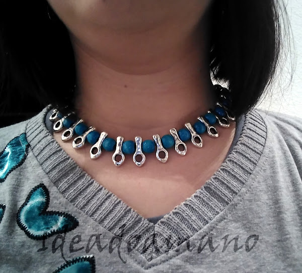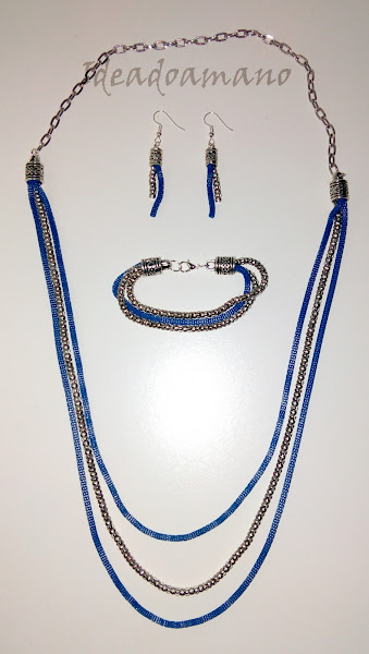 A continuación os enseño un conjunto de collar de varias alturas, pendientes y pulsera. Está hecho a partir de un collar sencillo de color azul eléctrico (ya sabéis lo poco que me gusta este color...). Son unos collares como de cadena de cordón que venden en muchos colores distintos y que siempre me han gustado pero son bastante sencillos... Aún así no me resistí a llevarme uno de la última feria de Creativa y lo tenía rondando entre mis materiales (como alguna otra cosa que aún os tengo que enseñar) y al fin me vino también la inspiración de en qué usarlo... lo junté con esta otra cadena y decidí hacer un collar de varias alturas, que quedan muy bien sobre una blusa o camiseta lisa (tampoco soy yo experta en moda, pero bueno):