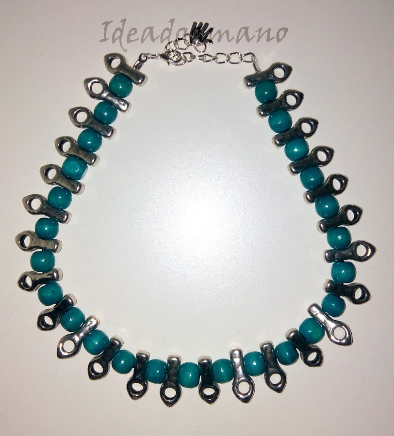 Primero os enseño esta gargantilla, inspirada en esa firma de los números que varias veces os he comentado que me encanta pero que se me sale de presupuesto. Os enseño también como queda puesta porque la verdad es que creo que gana bastante... Estas piezas metálicas yo las veía en la tienda y me llamaban, pero no sabía muy bien qué hacer con ellas, hasta que se me vino a la cabeza este tipo de gargantilla. Alguna vuelta más le daré a esta pieza pero de momento este resultado me ha gustado...