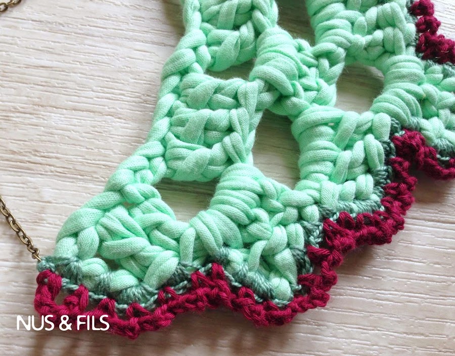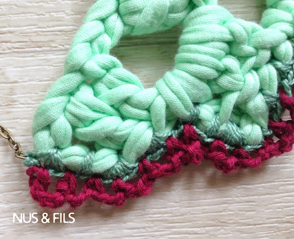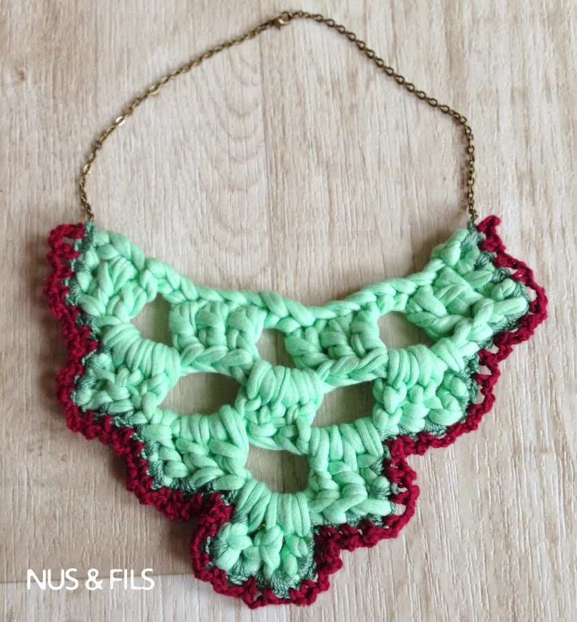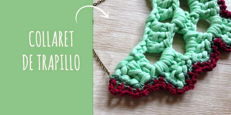 Como podéis ver me ha poseído una fuerza extrasensorial y no puedo parar de pensar en ganchillo y complementos como collares, anillos, brazaletes... sigo con la obsesión de la semana pasada; y si os cuento cuantas pruebas he hecho antes de acabar el de trapillo verde, no os lo vais a creer.