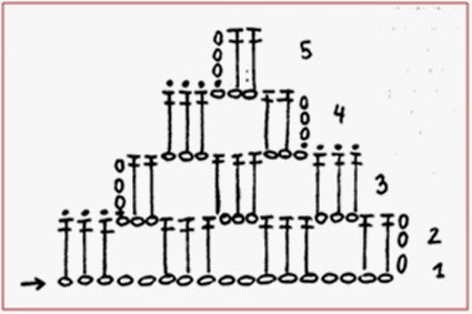 1ª volta: Començar la volta amb 3 cadenetes (que substitueixen un punt alt) i 2 p. alts en les 2 primeres cadenetes, teixir 3 cadenetes, saltar 2 cadenetes i teixir 3 p. alts en les següents 3 cadenetes. Continuar amb la seqüència fins tenir en total 4 grups de 3 p. alts.