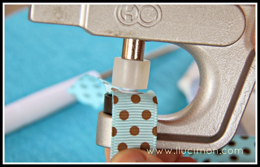 En este caso no se observa tanto, pero si lo que colocamos es la otra pieza (el macho), y no centramos bien la prensa al hacer presión, no sólo estaremos doblando el pincho, sino que también doblaremos la parte que sobresale y tendría que encajar sobre esta, lo que hará que no cierren bien. (Ésta suele ser la causa de error más común a la hora de colocar este tipo de cierres). Ahora procedemos de igual manera con la otra parte donde queremos que cierre (en este caso sobre una cinta). Marcamos y perforamos: