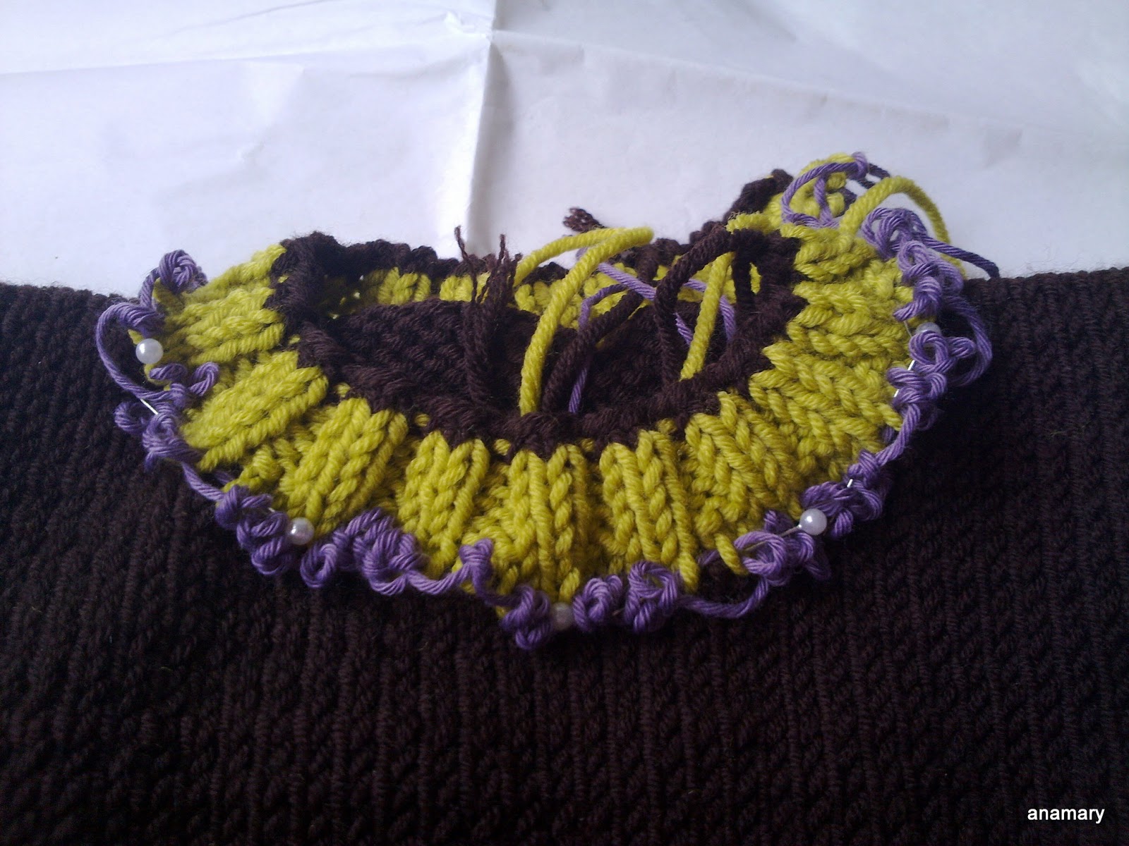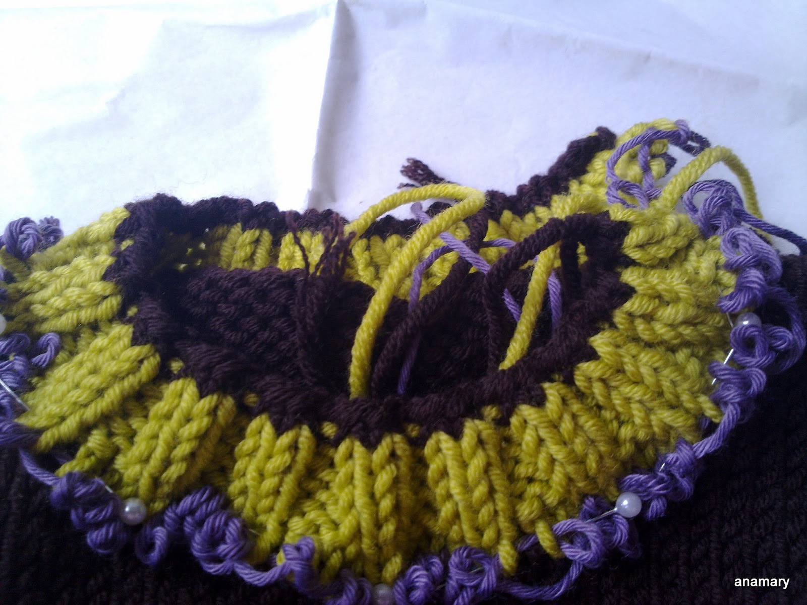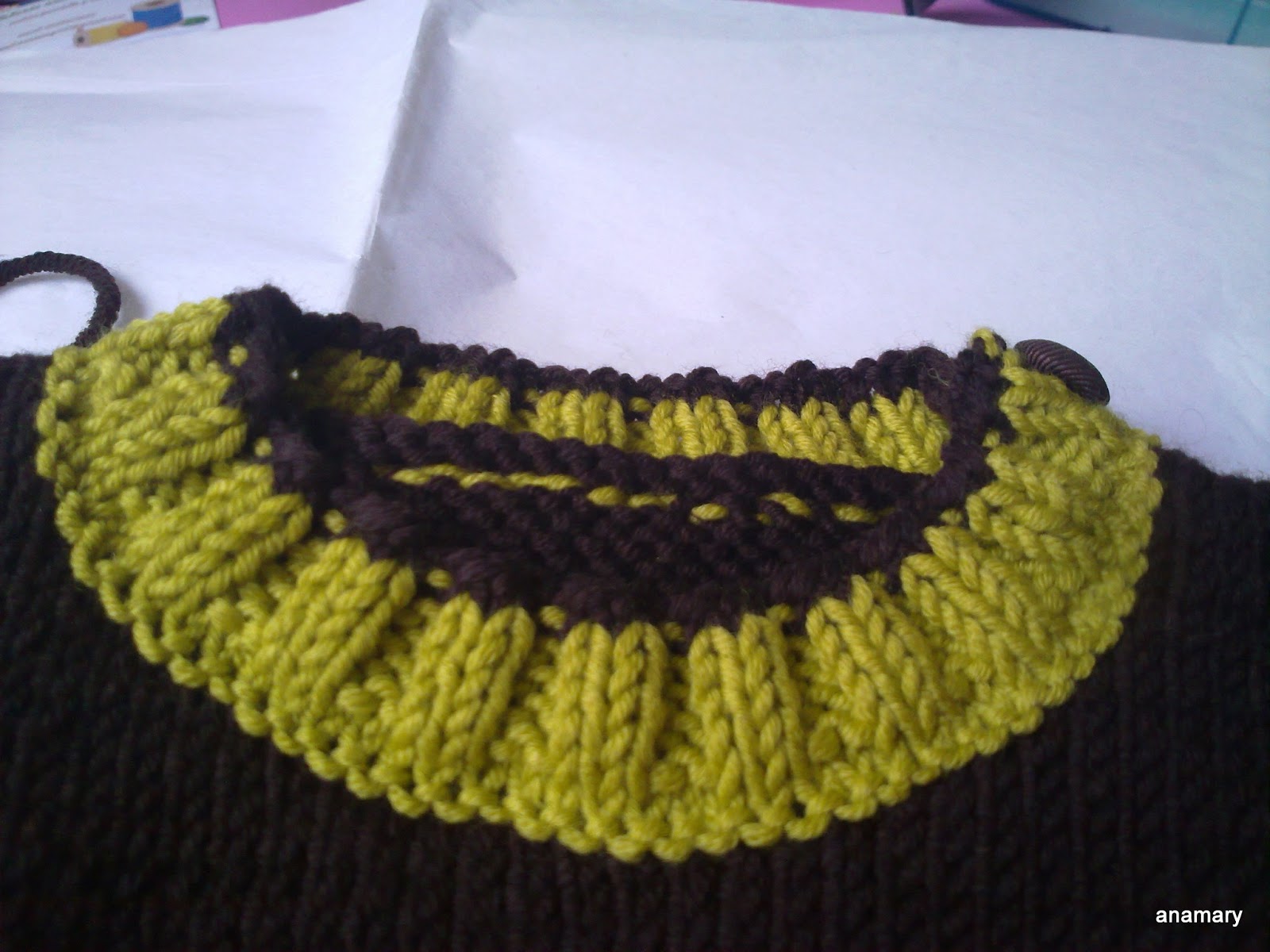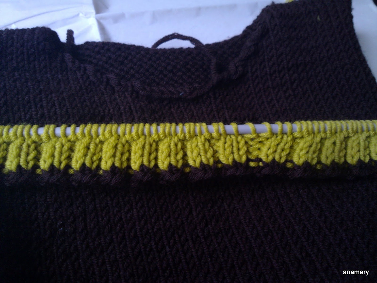 con un hilo de color diferente,hacemos dos vueltas en punto liso o jersey y lo soltamos de las agujas,estas dos vueltas que hacemos es para que no se nos deshaga el cuello al coserlo