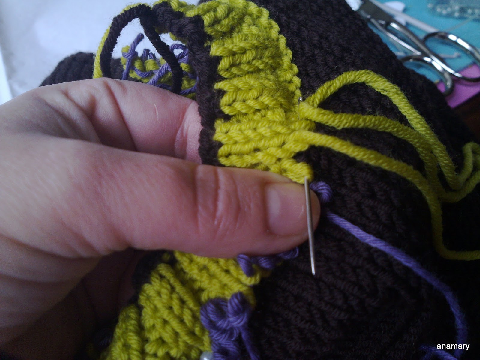 para ir cosiendo vamos deshaciendo el hilo de diferente color,enhebramos la aguja con el hilo que hemos dejado y la pasamos por el segundo punto hacia arriba