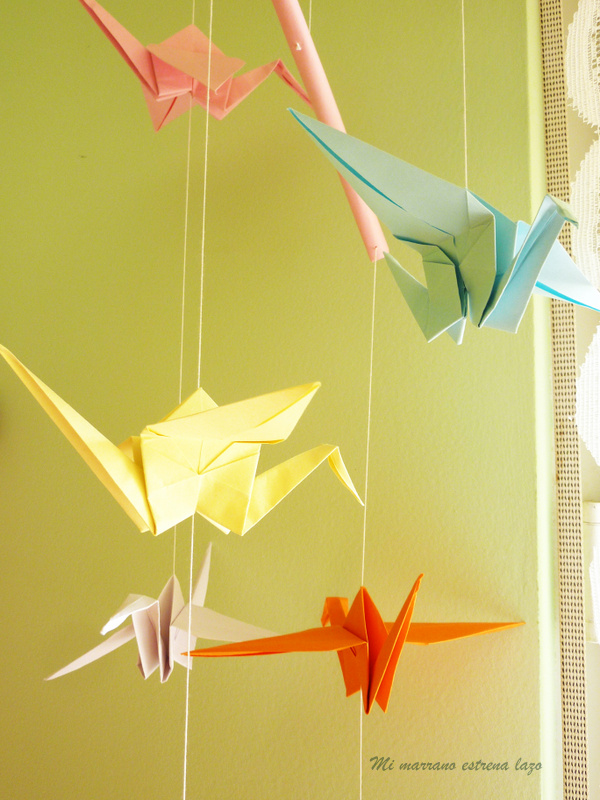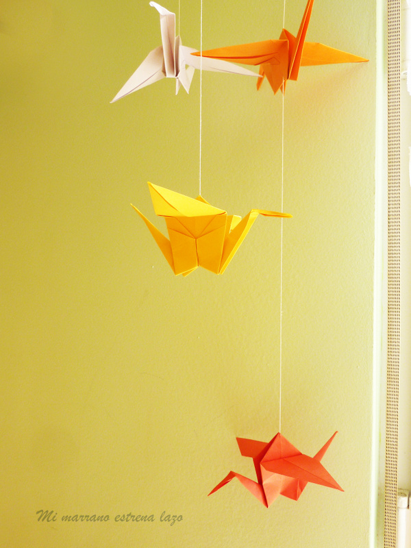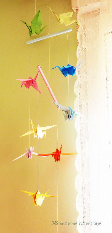 Me encanta este móvil de grullas, seguro que encuentro un sitio perfecto para colgarlo en la tienda, y será un buen taller para los peques, una tarde y se llevarán su propio móvil de grullas origami :)