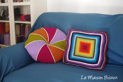 Ahora ha vuelto el invierno y ya está en nuestro sofá de forma permanente. Me gusta mucho cómo ha quedado y me hace feliz ver tantos colores cuando nos arropamos con ella. Finalmente, los restos de esta manta dieron para uno de estos cojines.