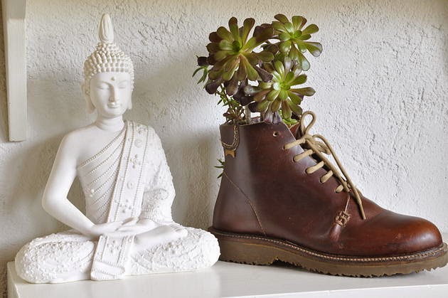 Simplemente es ir probando flores y elegir la que más le guste. Seguidamente cuando tenemos la planta ya trasplantada a nuestra maceta (que no se ve) la colocamos dentro del "zapato-macetero".