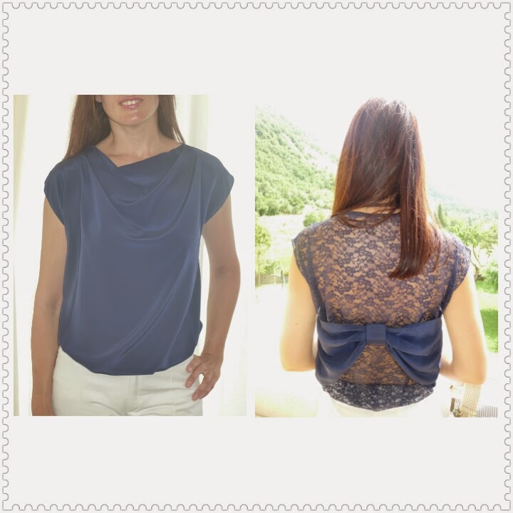 La verdad es que ha sido divertida la creación de esta blusa, una especie de experimento para aprovechar telas que por si solas no llegaban para una prenda entera. Pronto os enseñaré lo que estoy haciendo con el resto de la tela lisa, se trata de un pantalón que por rarito me está costando más tiempo de lo que querría, espero que valga la pena. Todo lo contrario que esta blusa, que se hace rápidamente. Sólo un pequeño apunte por si alguien se anima a hacerla, la pieza rectangular de la espalda ha de ajustarse sobre el cuerpo, para darle la anchura indicada, NO SE DEBE CORTAR DE LA MISMA ANCHURA QUE LA ESPALDA, ya que en este modelo quedaría demasido ancha y no se conseguirá el efecto deseado.
