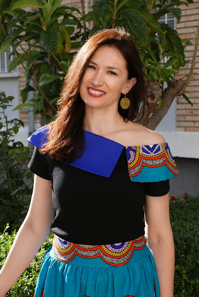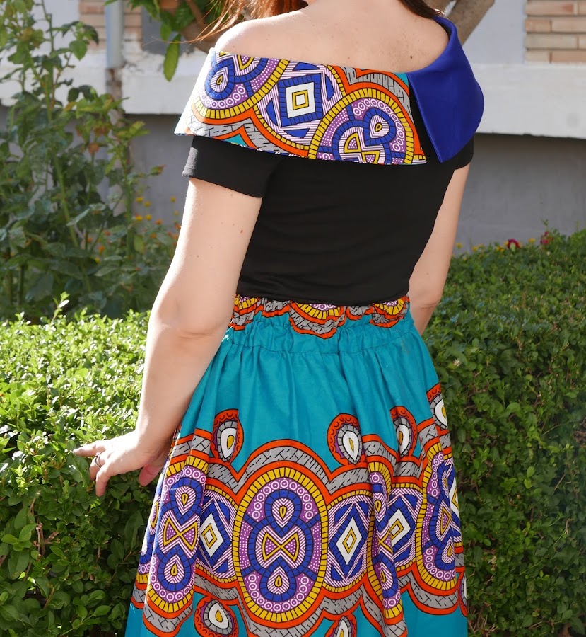 Las telas africanas tienen tanta fuerza que una buena idea para llevarlas a nuestro terreno es combinarlas. Esa es la idea que llevé a la práctica a la hora de hacer este conjunto de falda funcida y camiseta