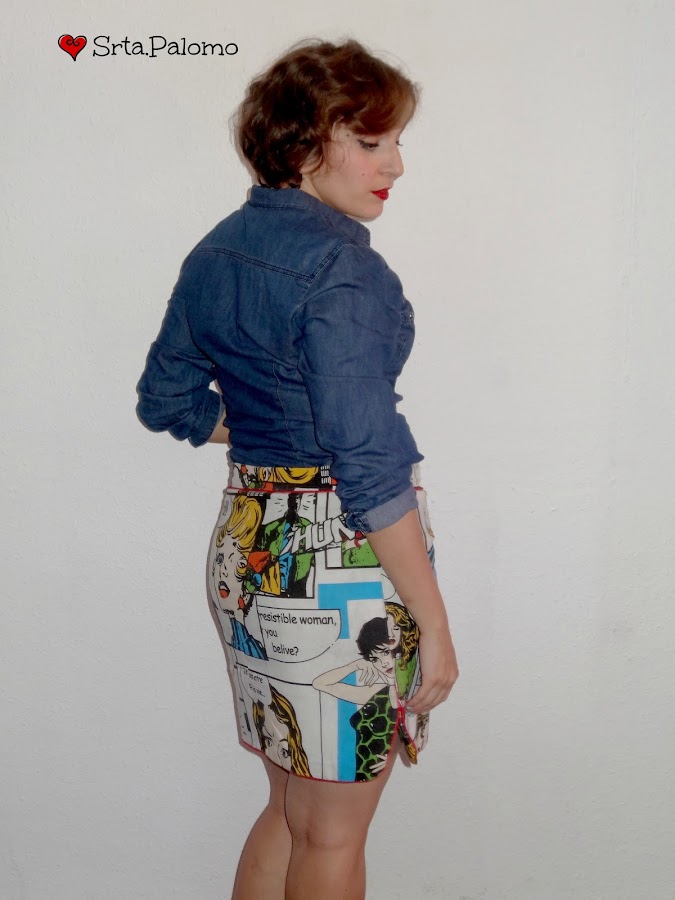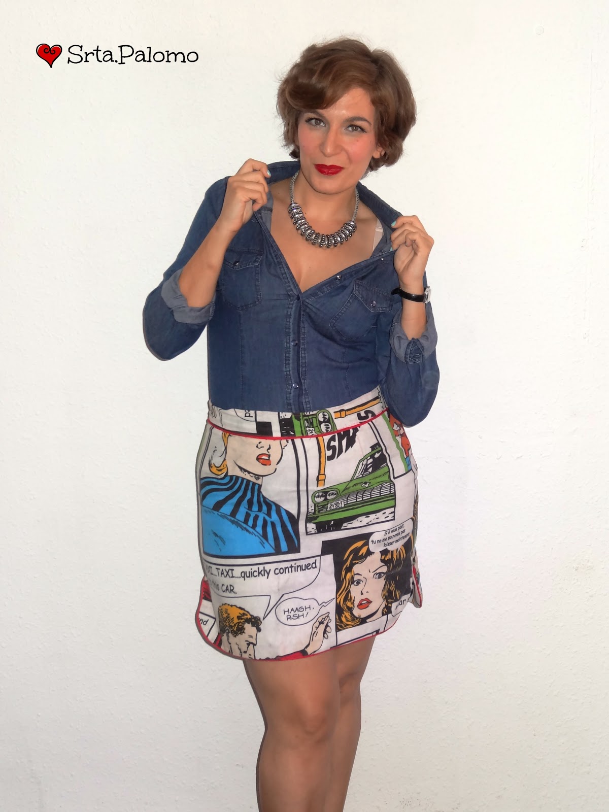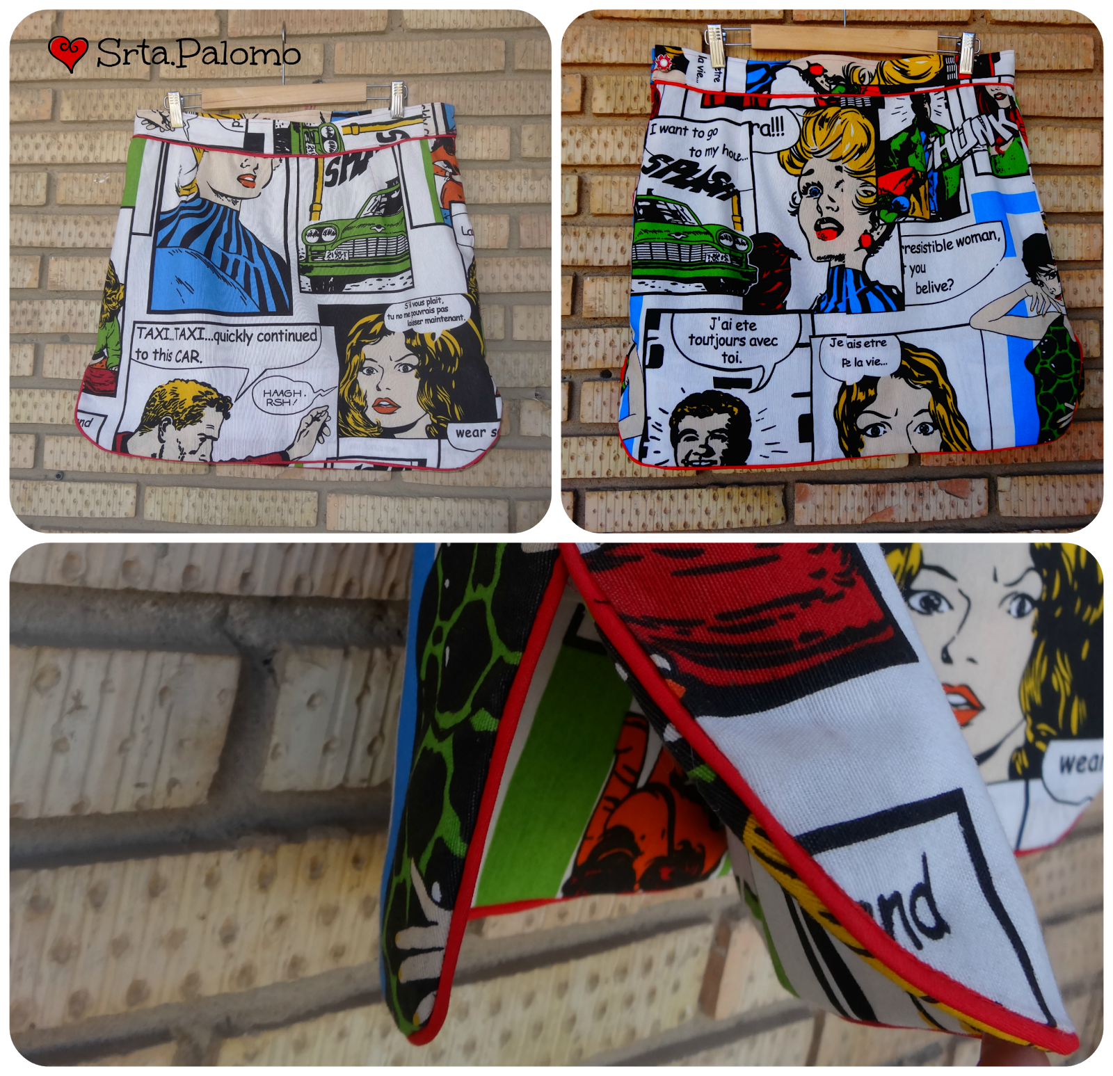 A ésto se une que tenía ganas de una falda con la tela de cómic con la que hago los bolsos (AQUÍ y AQUÍ) y uniendo ganas e ideas salió ésta falda