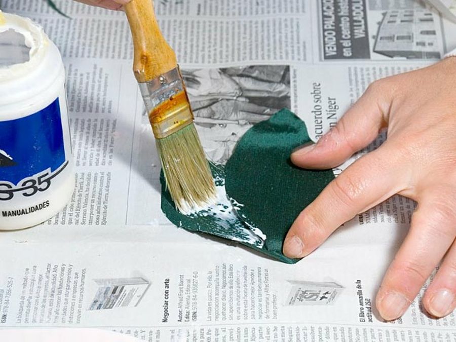 Aplicamos cola blanca mezclada con agua sobre las hojas de tela, para que se endurezcan y no se deshilachen por los bordes.