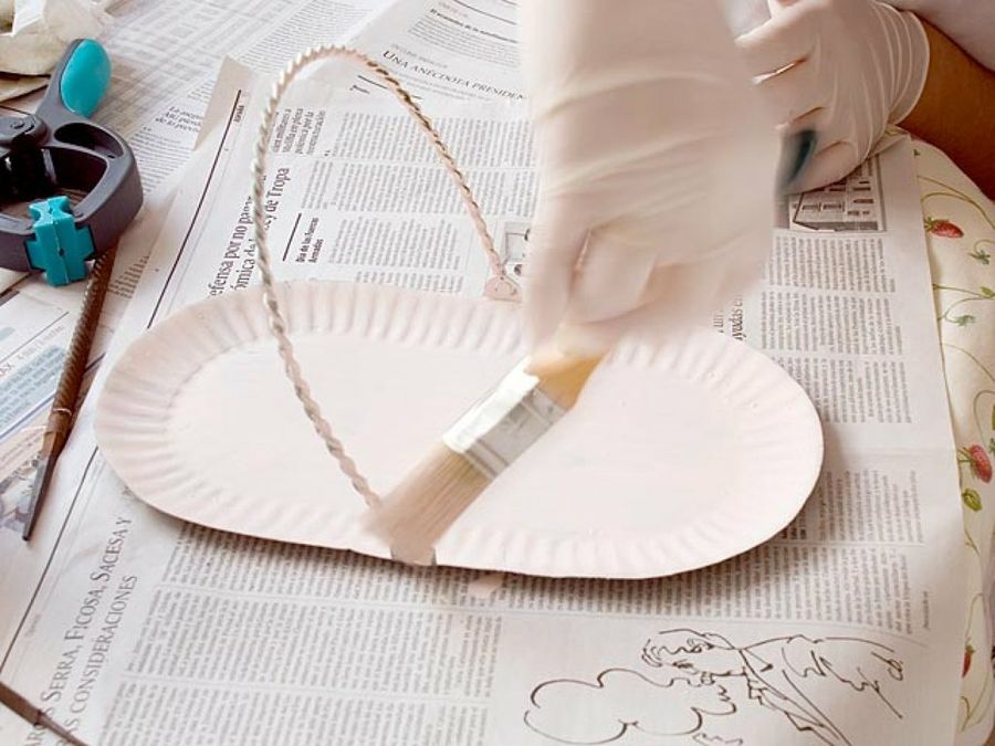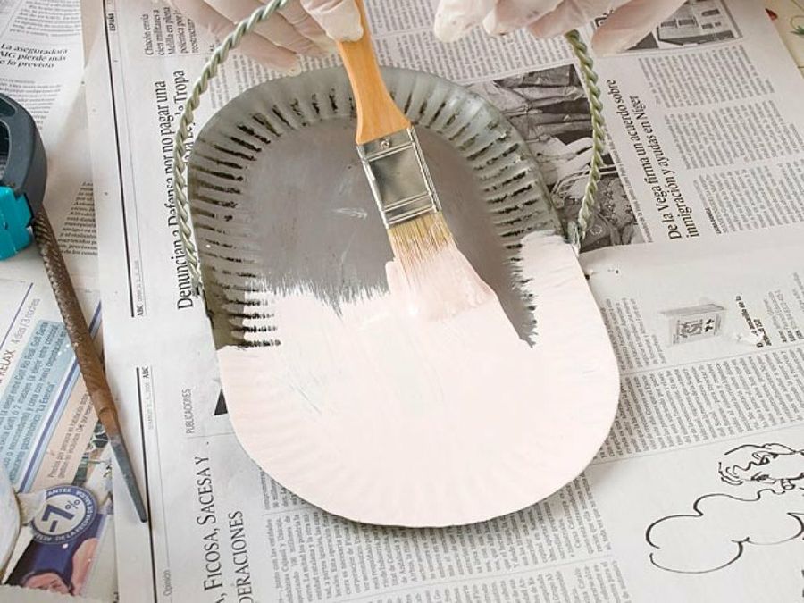 Comenzamos la tarea aplicando un disolvente que eliminará la pátina. Realizaremos esta labor con guantes de vinilo, cubriendo además la mesa con papeles de periódico, para no mancharla con las salpicaduras del disolvente ni con la pintura que después daremos a la bandeja.