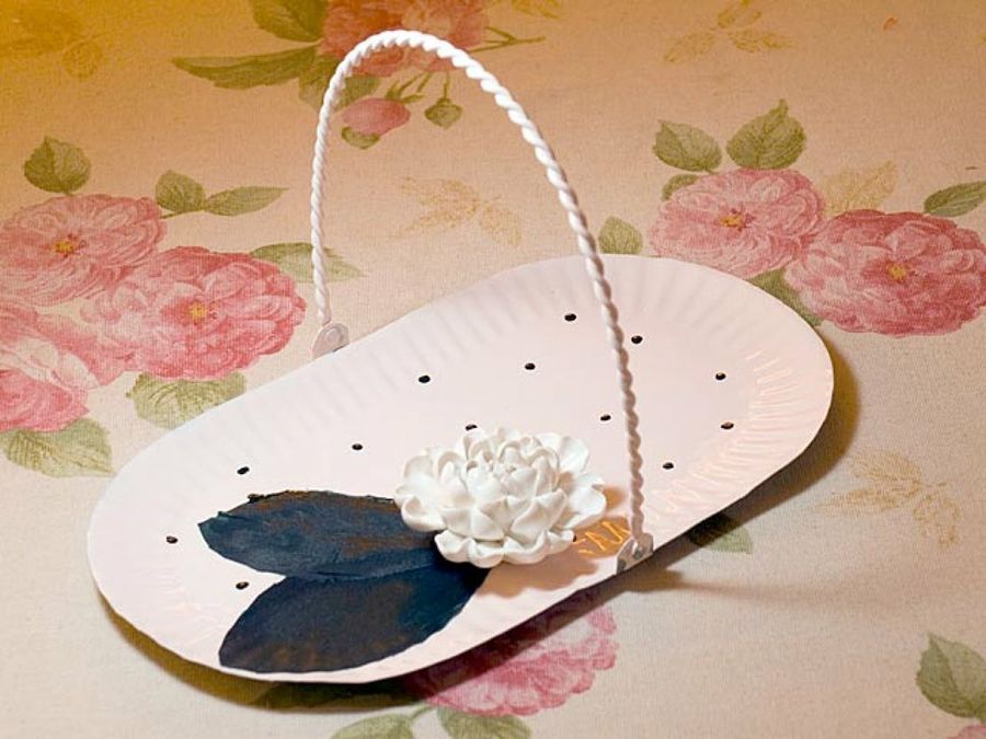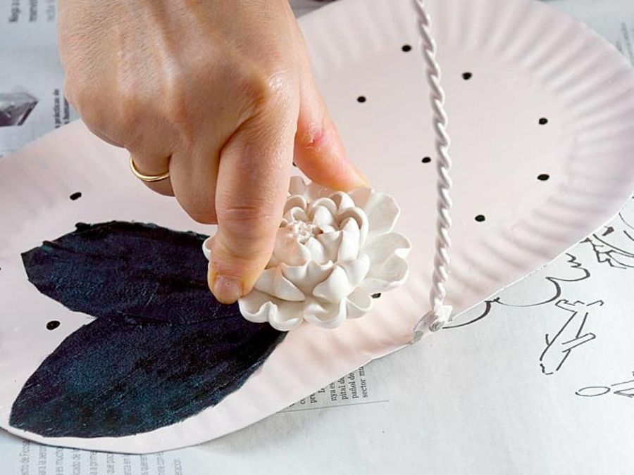 Colocamos la flor de cerámica en el extremo de las hojas, presionando unos segundos. Hemos dado a nuestra bandeja un atractivo diseño asimétrico.