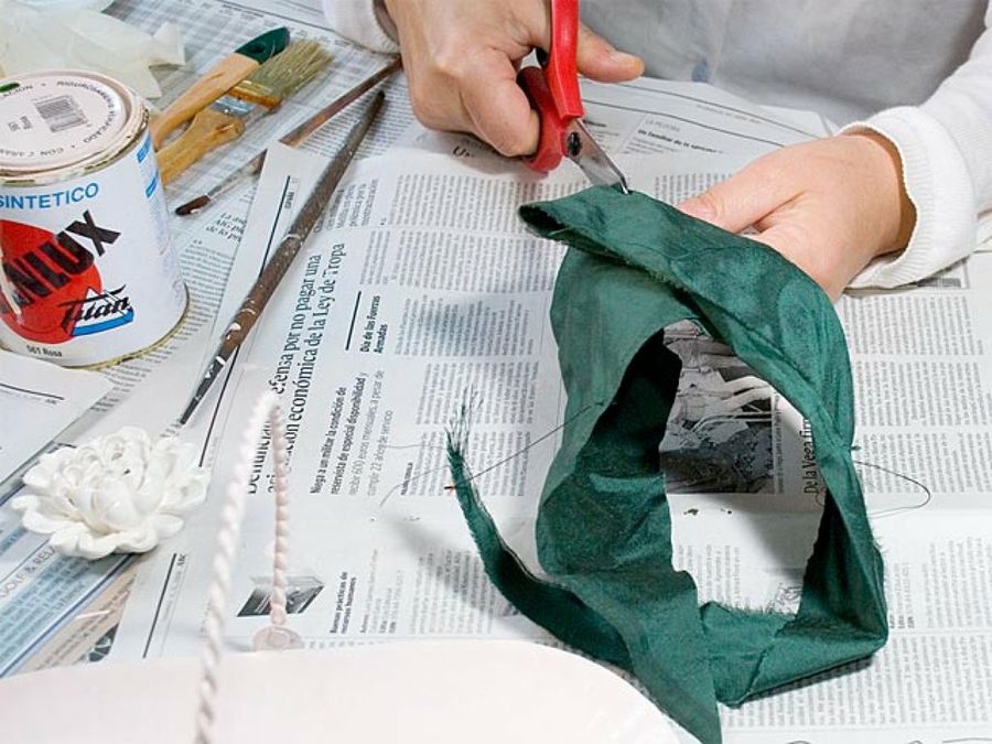 Mientras seca la segunda mano, confeccionamos el adorno de tela que completará el diseño floral de la bandeja. Recortamos en seda verde dos hojas.