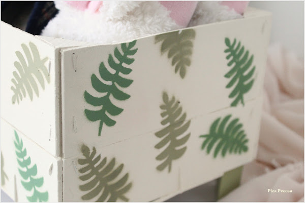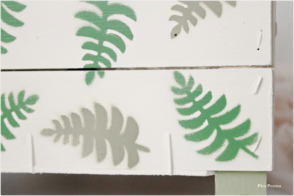 Para pintar las hojas de helechos hice un patrón recortando con un cúter la silueta en un trozo de cartón. Utilicé pintura en spray en dos tonos de verde (aunque en las fotos uno se ve gris) y la apliqué dando pasadas cortas, hasta quedar pintadas por completo: