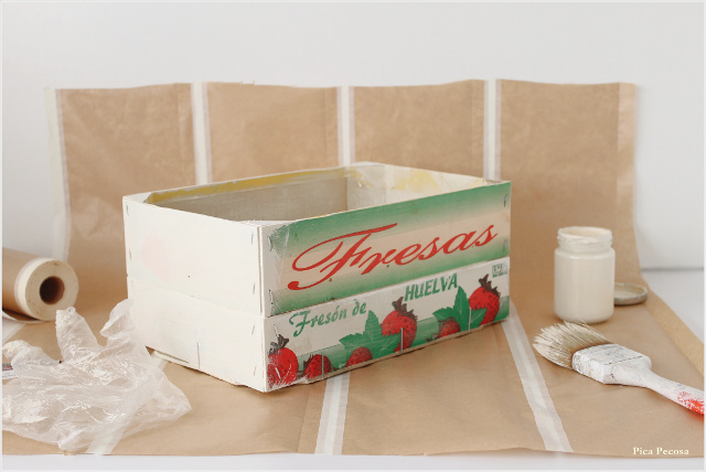 No sólo protegí de la pintura partes de la caja. Aprovechando que tenía papel con cinta, tapé la mesa y los azulejos de la cocina. Otro descubrimiento, porque pega muy bien y es resistente.
