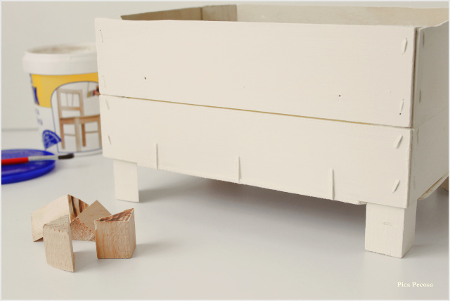 También se me ocurrió que podía aprovechar los tacos de las esquinas que sobresalen por encima, para pegarlos en la base con cola y hacerle unas patitas que quedan muy graciosas: