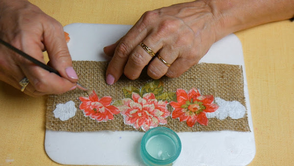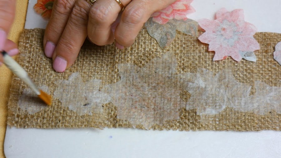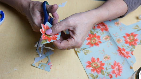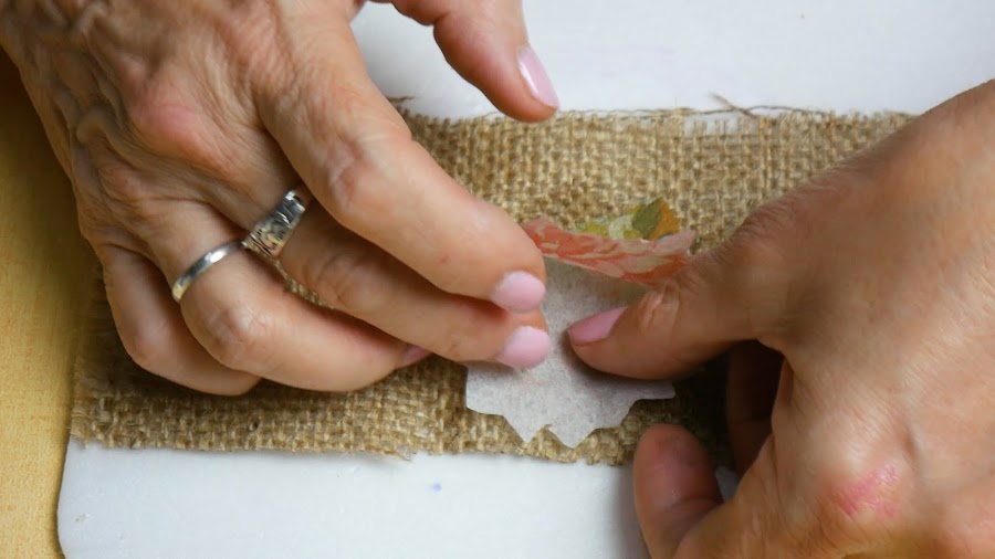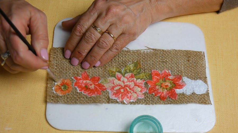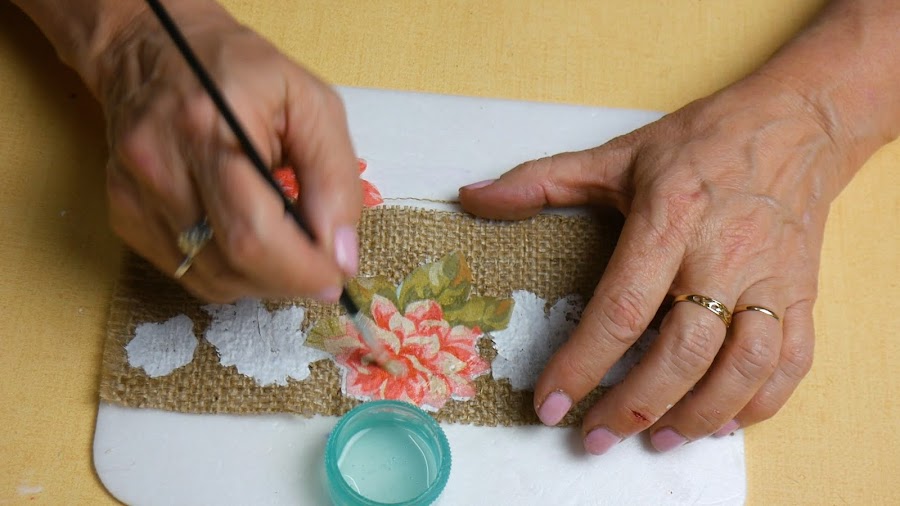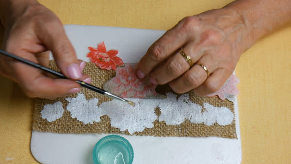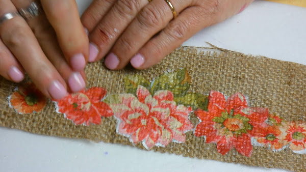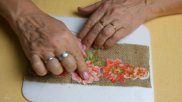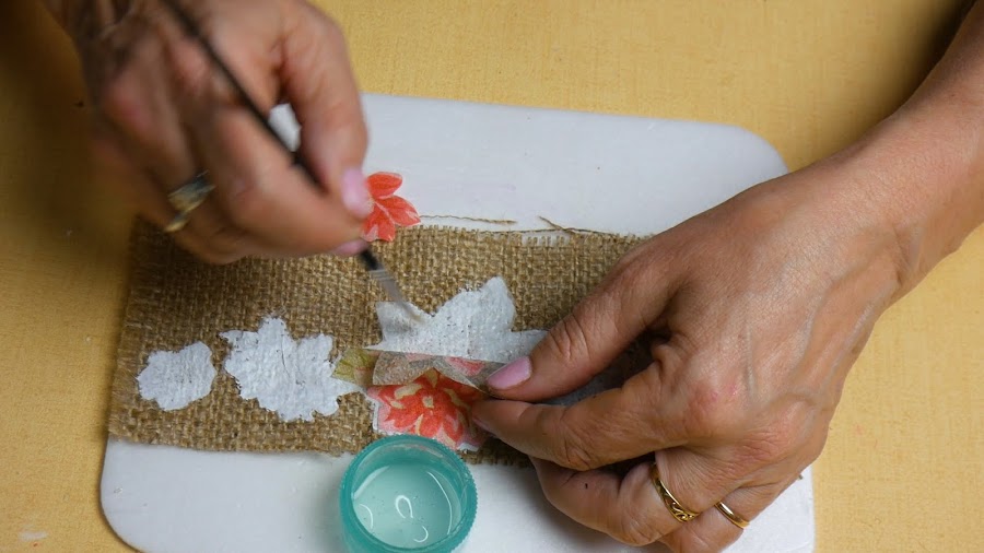 Completo pegando toda la guarda y antes de que se seque el pegamento, humedezco mis dedos con agua y presiono sobre la servilleta, para que ésta tome la forma de la tela que está debajo, siempre con los dedos húmedos para que no se me pegue la silicona y me rompa la servilleta.