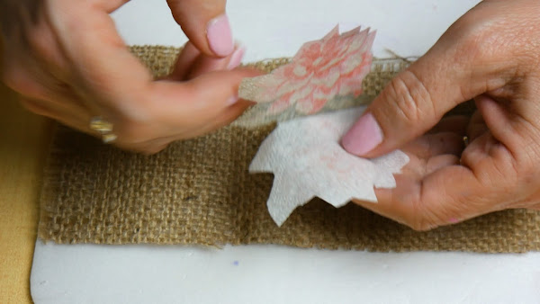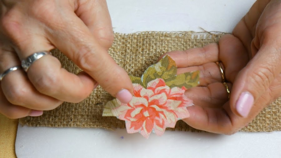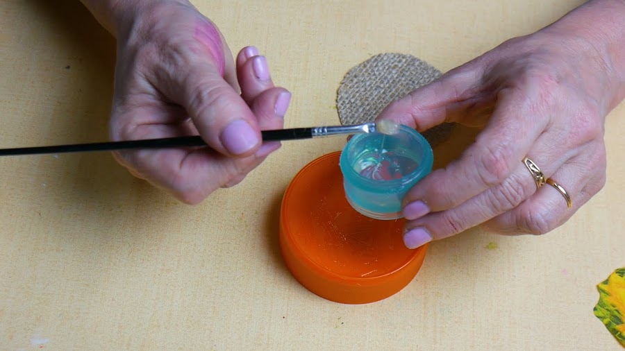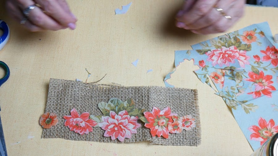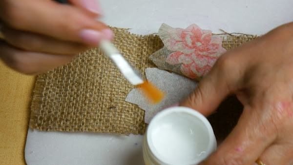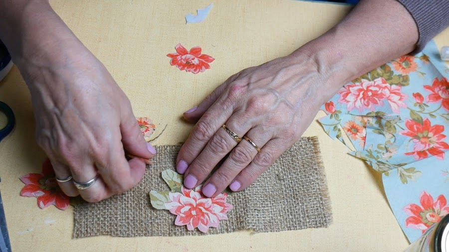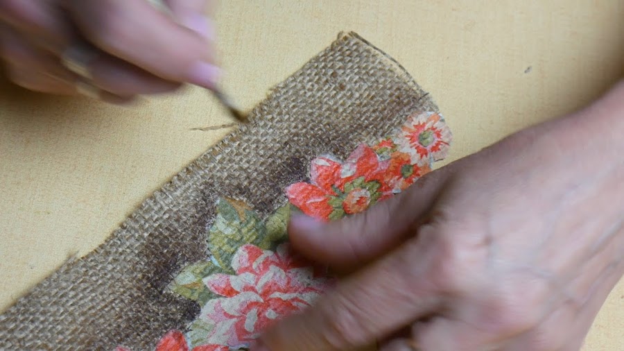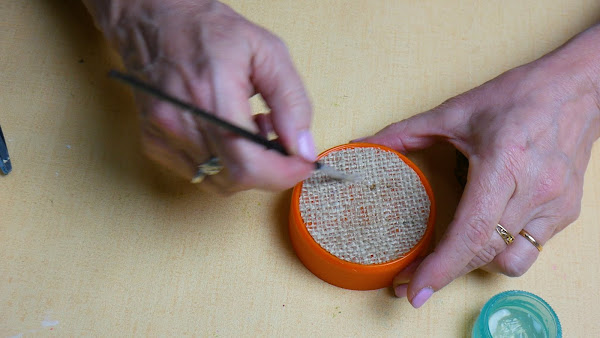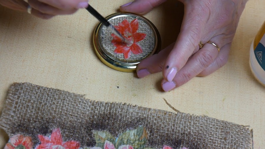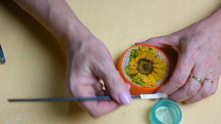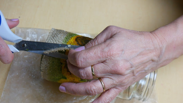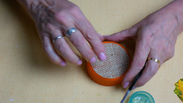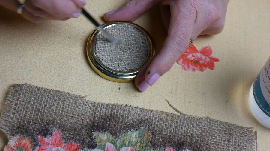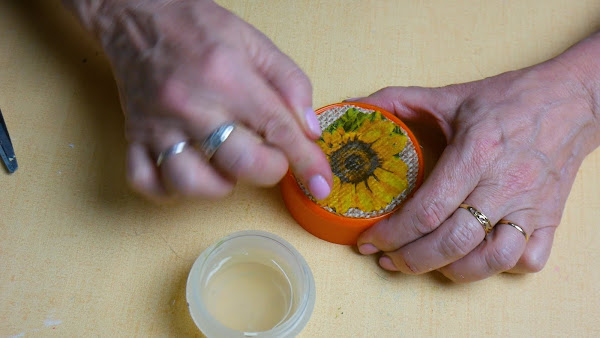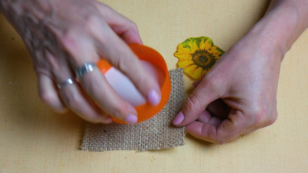 Al igual que en los girasoles preparo la tapa con un trozo de arpillera y una flor. La forma de pegarlo es igual que en la tapa de plástico.