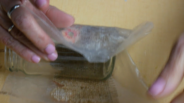 Coloco pegamento en la guarda y procedo a pegar en el frasco más pequeño, exactamente igual que en el anterior, presionando con las manos húmedas.