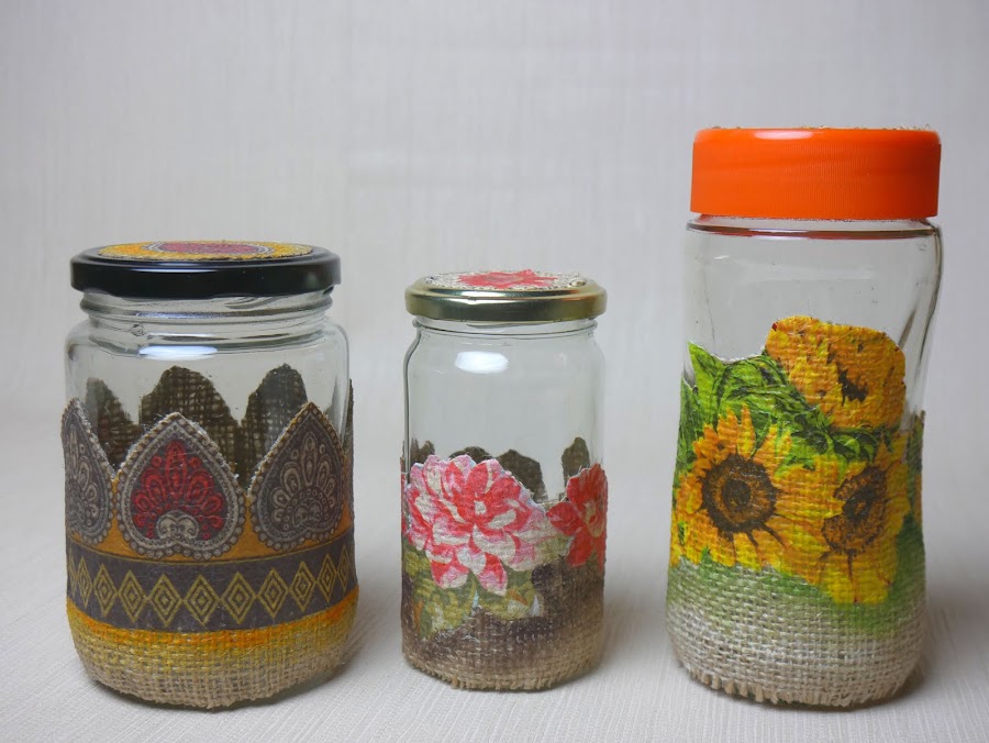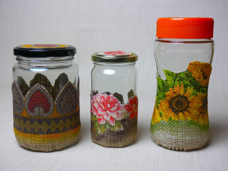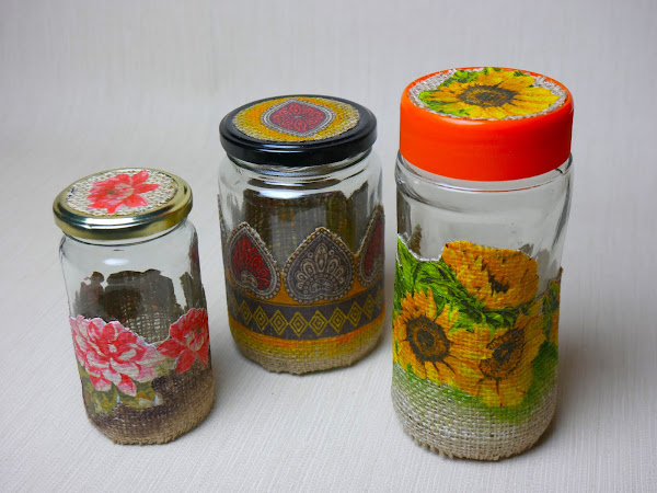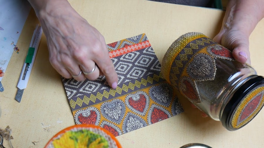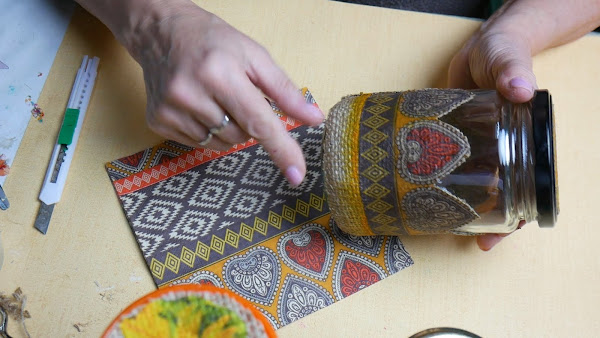Para este otro frasco usé ésta servilleta, recorté la guarda, la pegue sin fondo blanco y le hice la sombra con amarillo, para levantar los colores y también decoré su tapa.