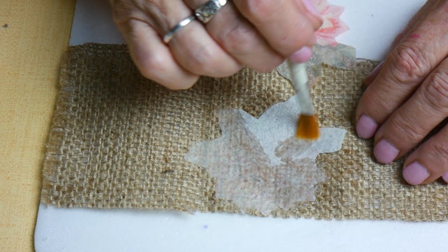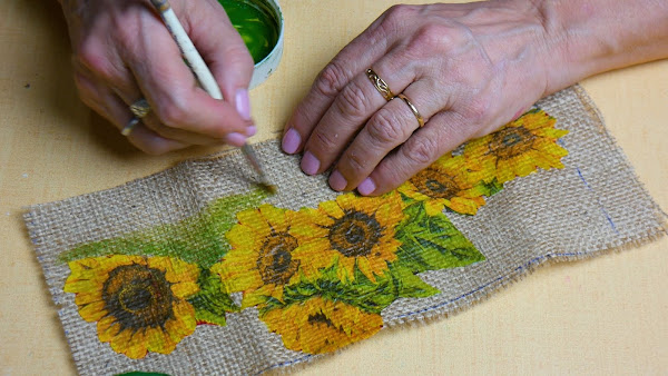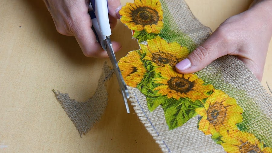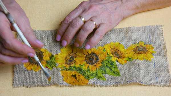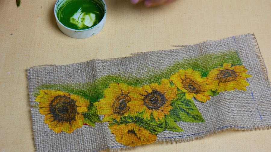 A éstos girasoles los recorté y los pegué en la tela directamente con silicona, no les di fondo blanco como en el anterior porque lo que busqué aquí es más rusticidad y los colores de los girasoles no se afectan tanto con el color de la arpillera como si hubiera pasado con las otras flores.