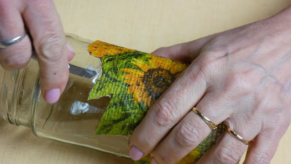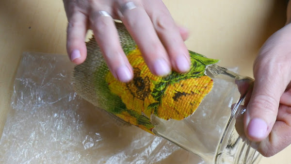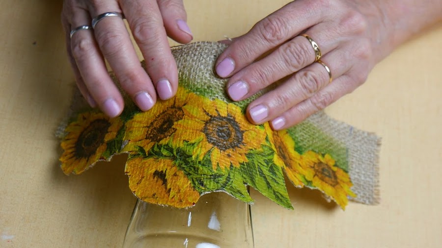 Para la tapa, marco un circulo en la tela y lo recorto. Lo pego con pegamento de silicona, me mojo las manos para aplastarlo para que se pegue bien y le coloco un girasol que también pego con silicona, quiero que observen lo fácil que se hace y la servilleta no se rompe.