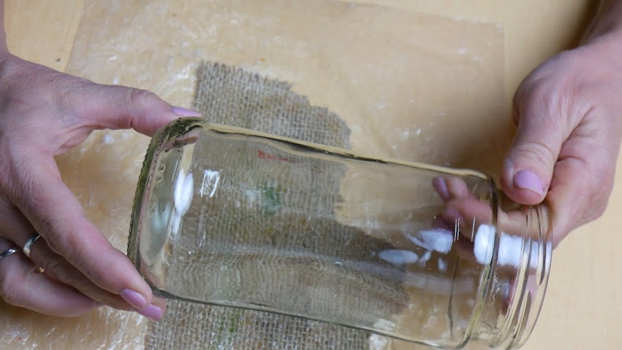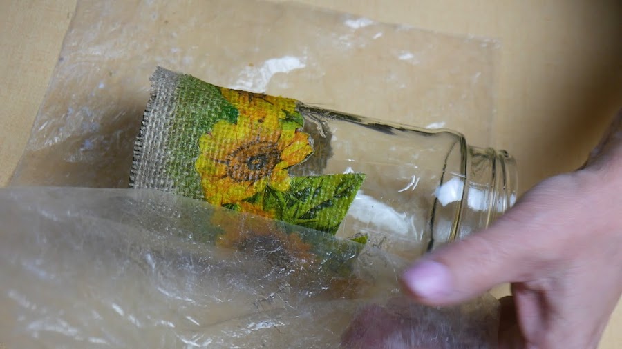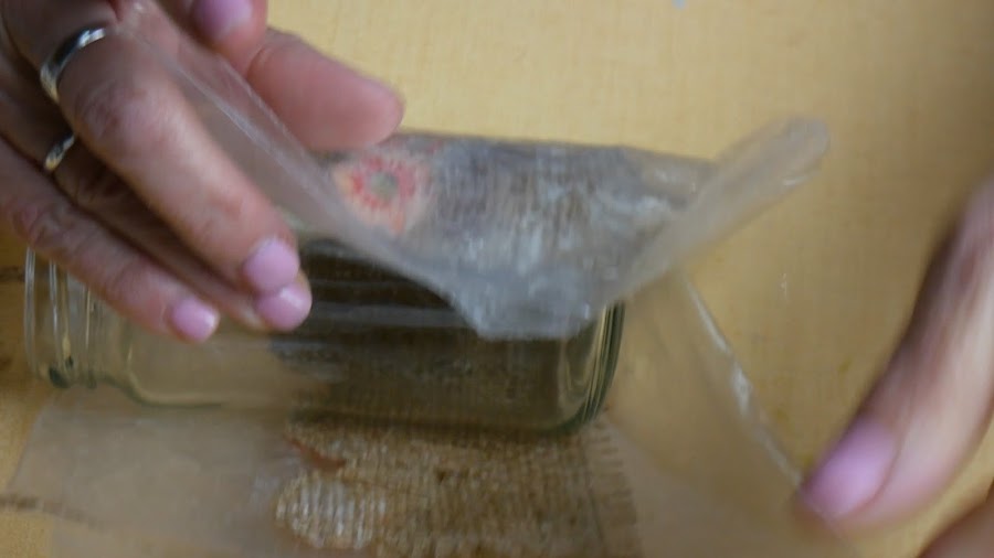 Apoyo el frasco teniendo en cuenta cual es la parte principal, y lo comienzo a envolver, ayudándome con el plástico.