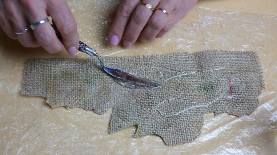 Distribuyo generosamente y lo desplazo con una espátula para que toda la tela quede cubierta e impermeabilizada.