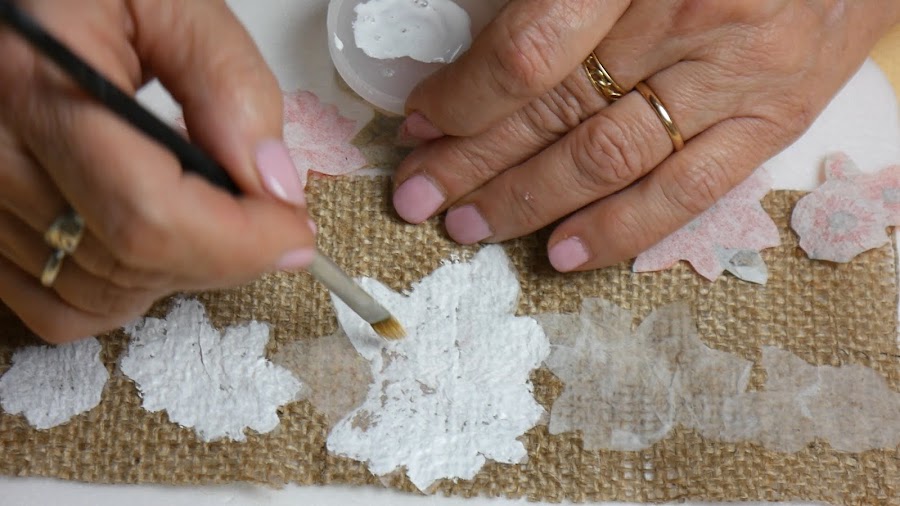 Cuando se seca con un pincel, pintura acrílica blanca y utilizando como guía el trozo de servilleta que pegué, pinto los contornos y el interior.