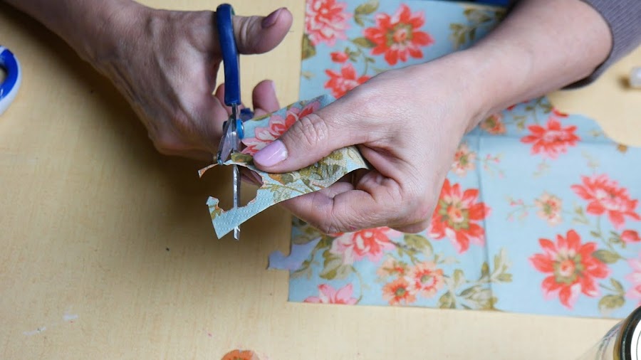 Una vez que está seca la guarda, con una tijera recorto los contornos de la parte superior, solo queda la servilletas pegada