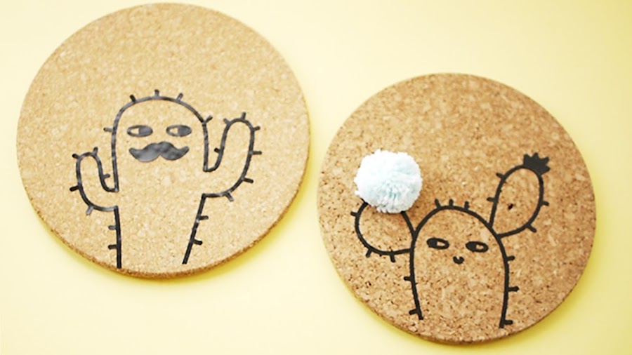 Los cactus los he empleado para hacer una especie de cuadros. He cogido dos salvamanteles de corcho y he pegado los vinilos de los cactus. Además, para darle un toque más gracioso he pegado un pompóm de lana a modo de florecilla.