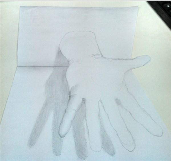 Luego de que tengas el boceto recorta siguiendo la línea en ángulo y el pulgar¸ esto dejará a esta estructura fuera del dibujo, luego da sombra con el lápiz a la división de la hoja. Esto dará efecto de profundidad.