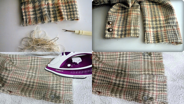 Por último, descoso el bajo y el forro. Corto el sobrante del bajo para que no me quede excesivamente larga la chaqueta. Desfleco el bajo al igual que hice con las mangas. Cambio los botones delanteros. Vuelvo a coser el forro y plancho bien el bajo para quitar la doblez.