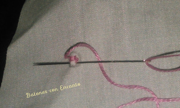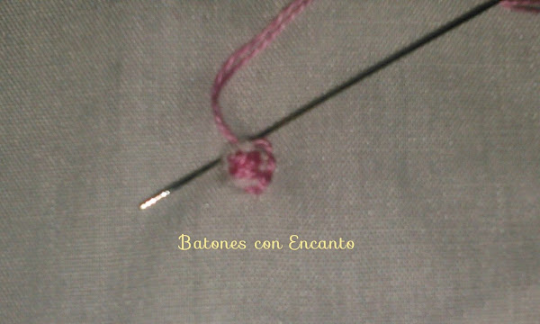 3º Ahora empiezo a bordar el panete ,de arriba- abajo. La aguja la pongo un poquito más abajo de la mitad del circulo, para hacer la primera puntada.