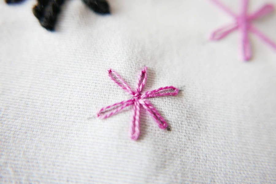 Pues con el rotulador Frixion y una regla. Así vamos formando lo que yo suelo llamar estrellas. Con esta sencilla referencia ya tenemos la base para ir bordando sobre esta las flores.