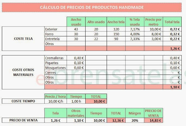 Pensaréis que estoy loca con tanta precisión, pero a mi me ha pasado a veces que calculas un precio y te dás cuenta que ese producto no es viable, "si tardo dos horas y media en coser una carterita para llevar maquillaje por el que alguien está dispuesto a pagar 16 euros pierdo dinero por todas partes", más que nada porque podría dedicar ese tiempo en coser otra cosa con la que gane dinero, a la vista está como cambia el tema si aumentamos el tiempo: