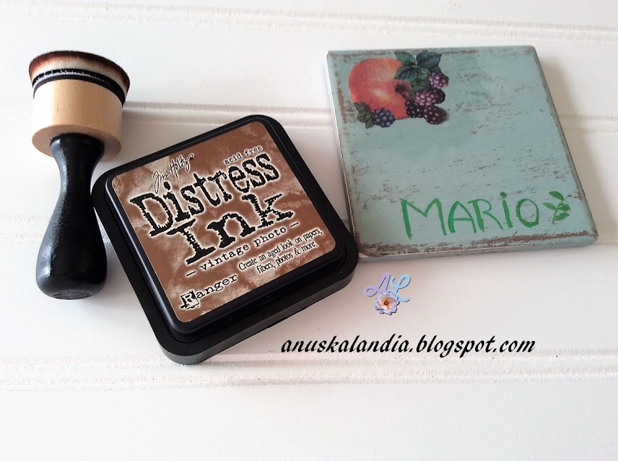 4.- Ya sabéis lo de mi querencia últimamente por la tinta de scrap, así que de nuevo la vamos a utilizar para dar un toque vintage y el segundo toque envejecido alrededor del posavasos. Por último, le pasamos una mano de barniz acrílico a todos y ya habremos terminado de CAMBIAR EL ASPECTO, que es lo que nos pedía Lola para participar en este reto amistoso.