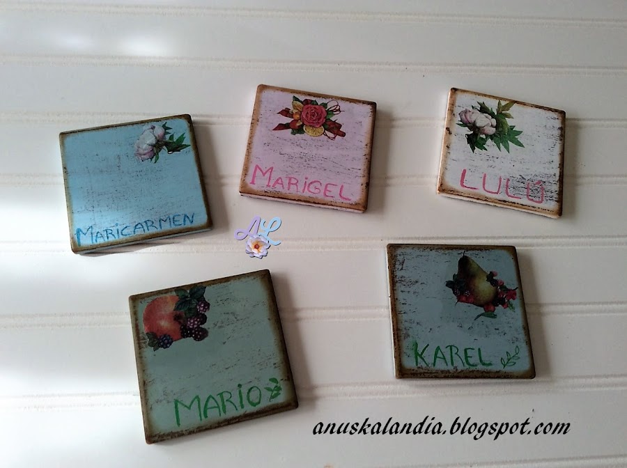 3.- De una lamina de papel de arroz, con los motivos de nuestra elección, elegimos pequeños, de un tamaño que nos quepan en los posavasos. Yo los he puesto en las esquinas, tu puedes ponerlos donde prefieras, incluso más grandes y que lo ocupen todo. Antes de pegar el papel de arroz, podemos poner el nombre de la persona a quien se lo regalaremos, para así personalizarlo más. Lo haremos con rotuladores permanentes.