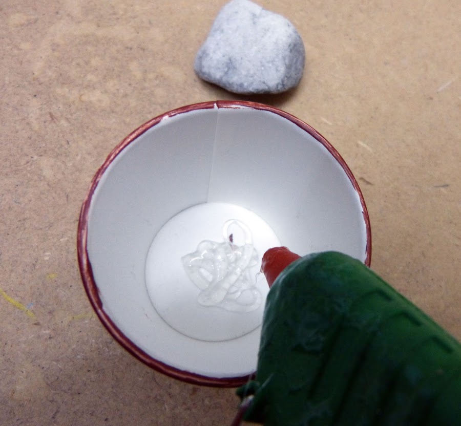 Vertemos un buen chorretón de silicona caliente dentro del vaso, y sin dejar que enfríe, ponemos la piedra, que nos servirá para darle estabilidad a nuestra maceta.