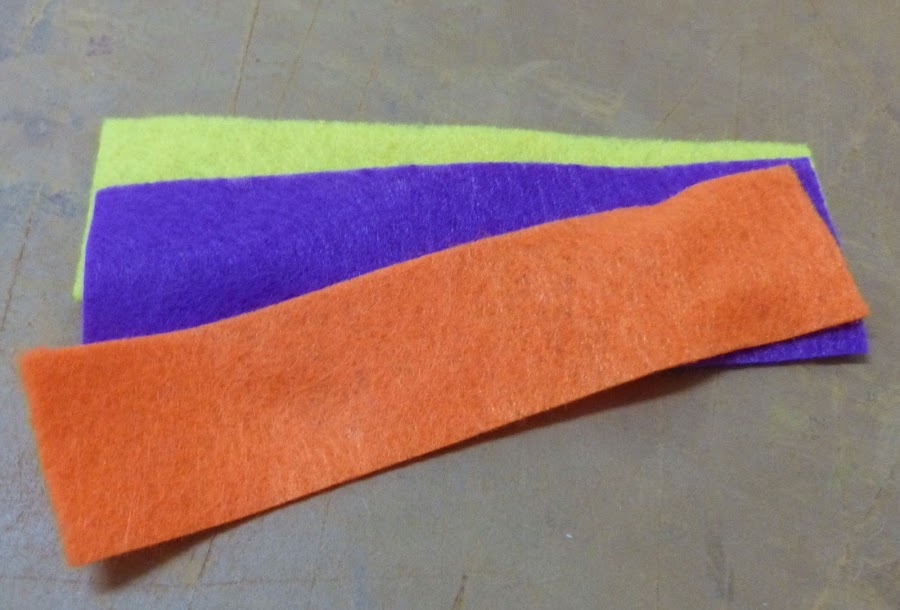 Tres retales de fieltro de diferentes colores, de 15cm x 3cm