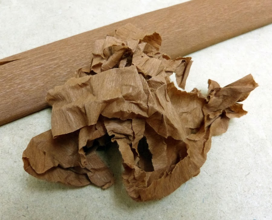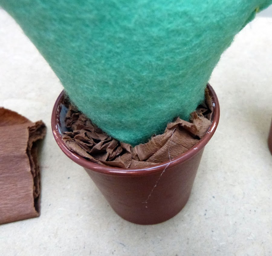 Así el cactus ya estará pegado a la maceta, pero para darle mas estabilidad, rasgaremos un trozo de papel crepe, o crespon y lo pondremos arrebullado entre la maceta y el cactus, para ajustarlo bien.